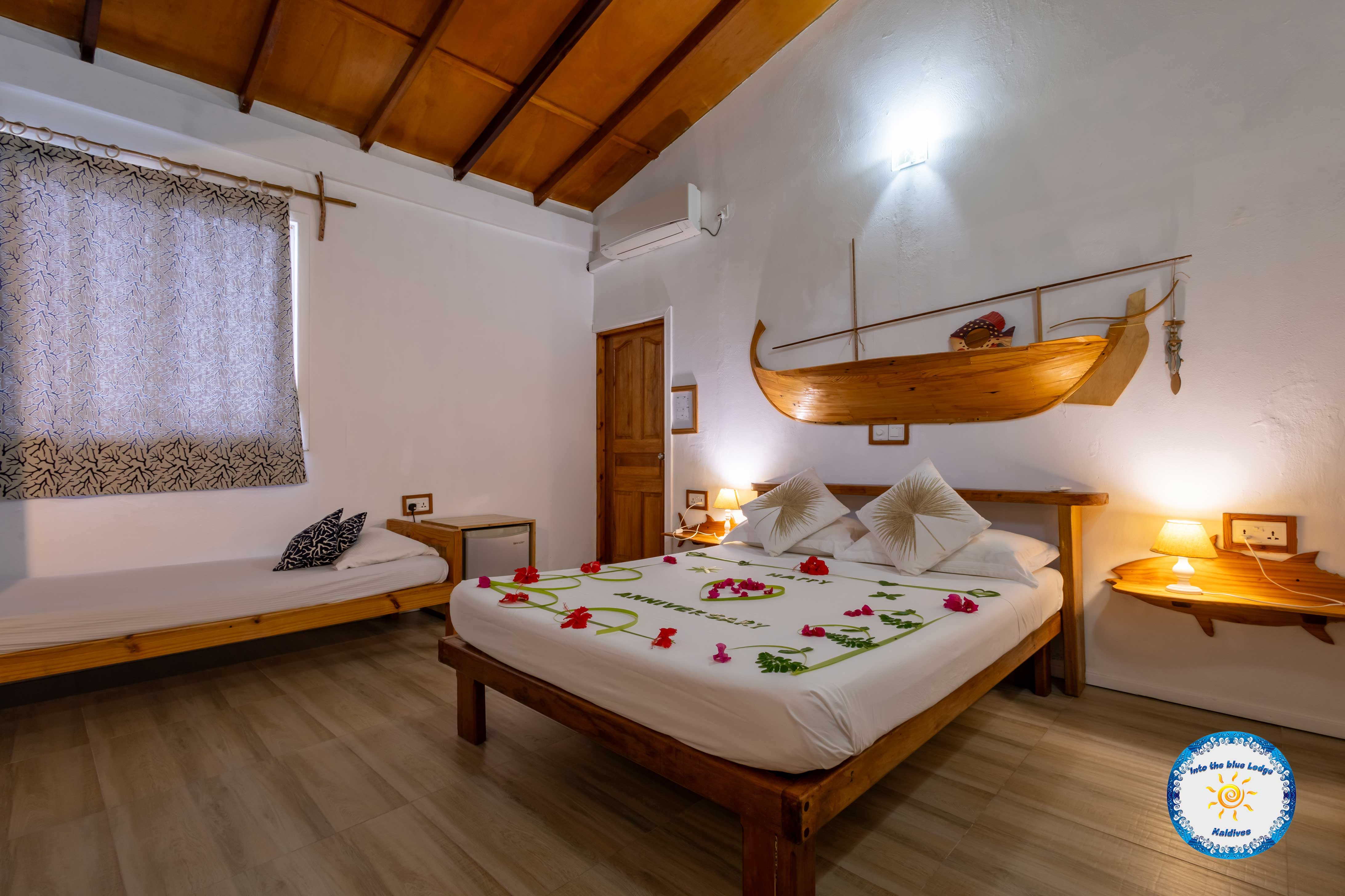 Book nowTriple room first floor with terrace, 20 sqm. The room has a large double bed and a single bed with minibar, air conditioning, ceiling fan, wi-fi, mini bar, safe and beach towels. Large bathroom with shower.